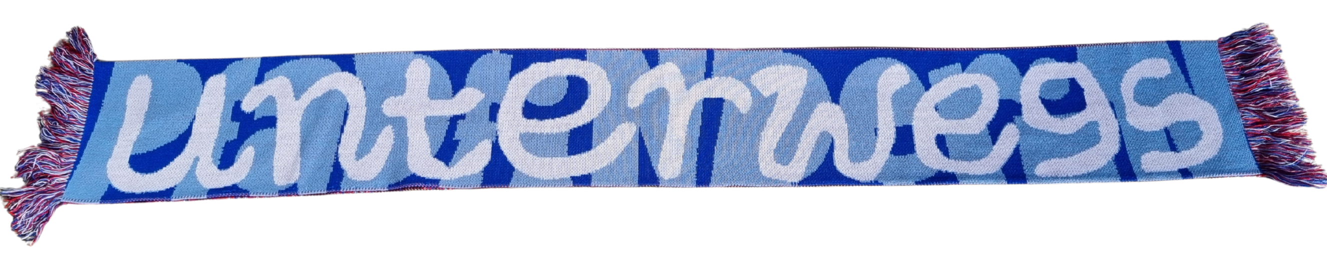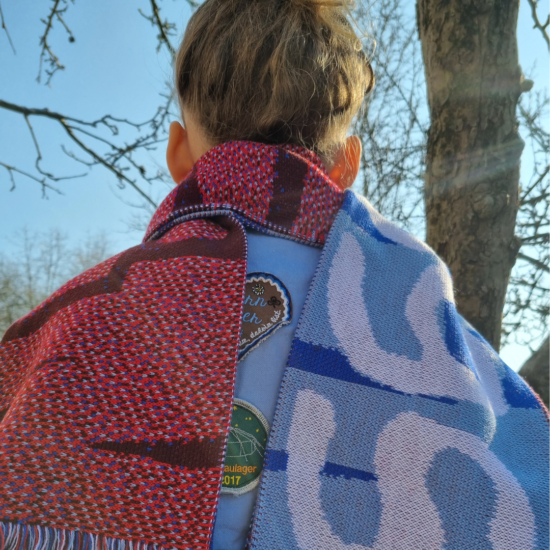 Du hast die Wahl zwischen einem Schal mit Hintergrund und Vordergrund in verschiedenen Blautönen oder einem Schal in Blautönen auf der einen und Rottönen auf der anderen Seite.